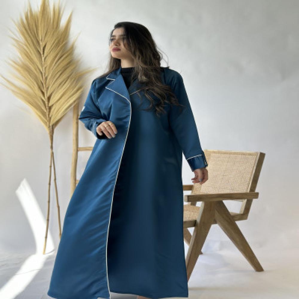 عبايه ملونه زرقاء مع خطوط بيضاء على الحواف والأكمام تضيف لمسة عصرية وراقية. تصميم واسع على شكل بليزر مناسب للاستخدام اليومي والمناسبات الخاصة .
